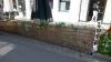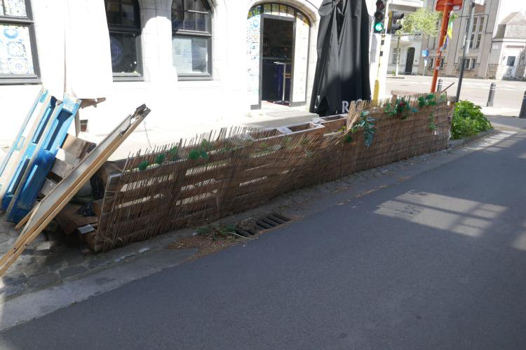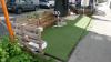 Zelfgemaakte terras gemaakt met diverse houten palletten + kunstgras en rieten omheining
