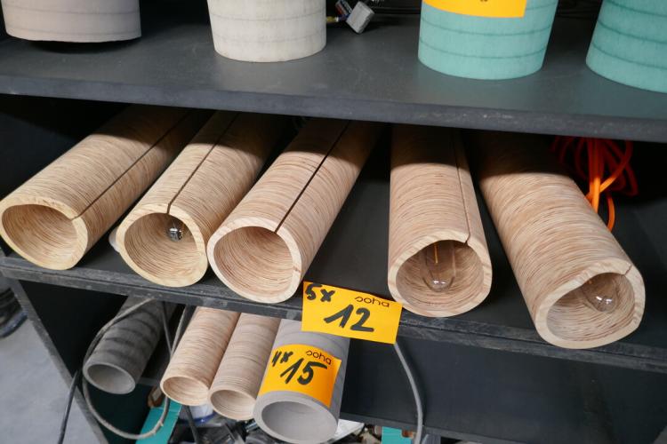 5 hanglampen lichtebruine gelamineerd INTERLUDE