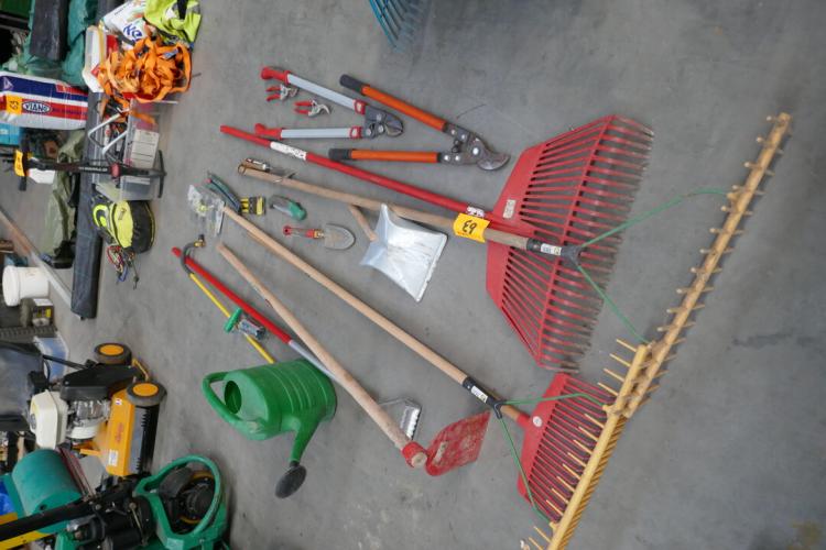 Tuingereedschap : Plastieken bladharken - takkenschaar - tuinscharen - troffel - gieter - enz….